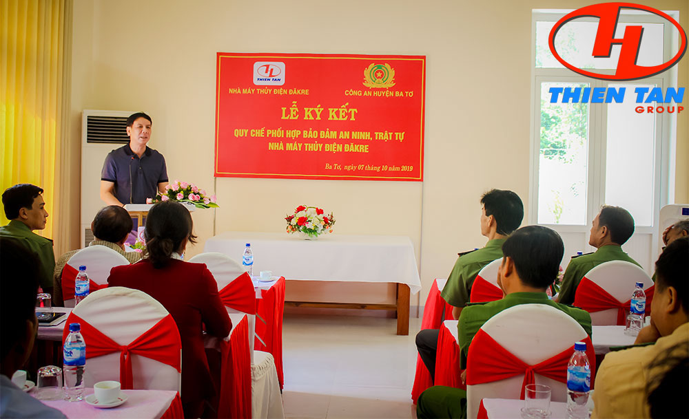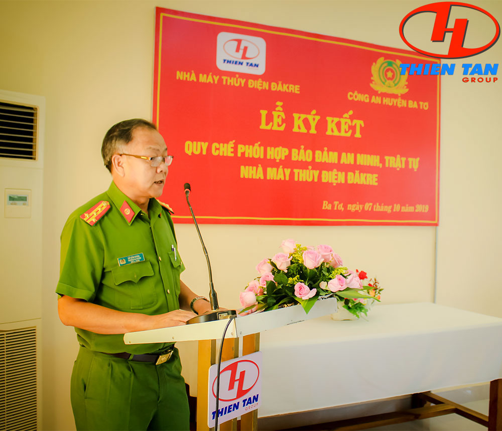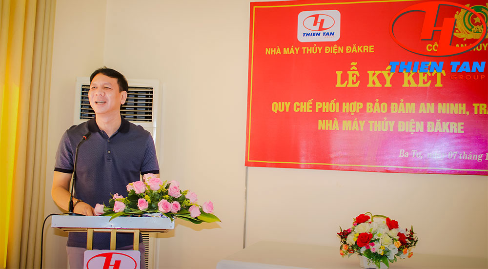 Tại buổi lễ, ông Huỳnh Kim Lập, Chủ tịch HĐQT Thiên Tân Group, Giám đốc Công ty Cổ phần Thủy điện Thiên Tân cảm ơn sự quan tâm chỉ đạo của Công an tỉnh và huyện Ba Tơ, sự phối hợp chặt chẽ của Công an địa phương trong thời gian qua và đánh giá cao mục đích, ý nghĩa của việc ký kết Quy chế phối hợp trong công tác bảo đảm an ninh trật tự tại Nhà máy Thủy điện Đăkre