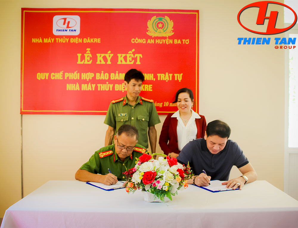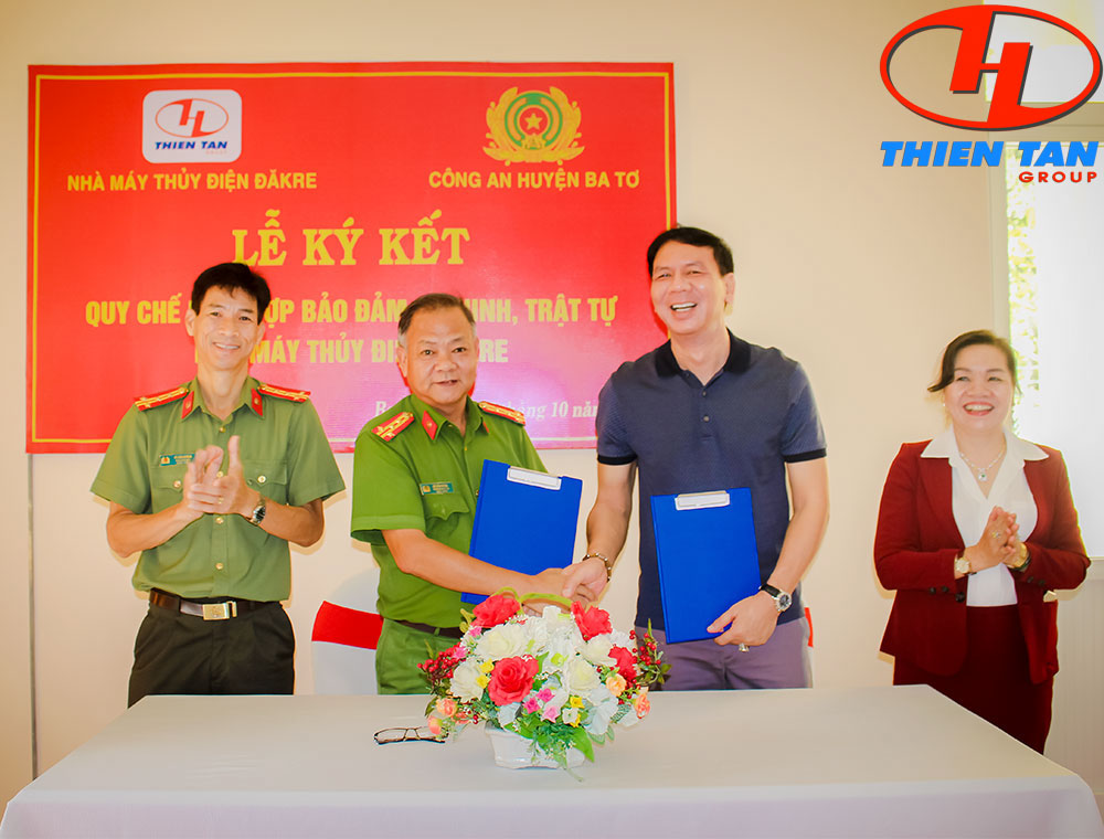 Trong buổi lễ, hai đơn vị đã cùng kiểm điểm, đánh giá tình hình, sự phối hợp giữa hai đơn vị trong công tác đảm bảo an ninh trật tự tại Nhà máy Thủy điện Đăkre và cùng nhau cam kết thực hiện tốt những trách nhiệm, nghĩa vụ được đề ra trong bản Quy chế phối hợp. Lãnh đạo Công ty Cổ phần Thủy điện Thiên Tân và Công an huyện Ba Tơ đánh giá cao mục đích, ý nghĩa của việc ký kết Quy chế phối hợp trong công tác bảo đảm an ninh trật tự tại Nhà máy Thủy điện Đăkre, nhằm phát huy sức mạnh tổng hợp của các lực lượng, nâng cao hiệu quả trong công tác phối kết hợp, chủ động phòng ngừa, phát hiện và đấu tranh có hiệu quả với hiện tượng, hành vi gây mất trật tự an ninh tại địa bàn nhà máy trong thời gian tới.