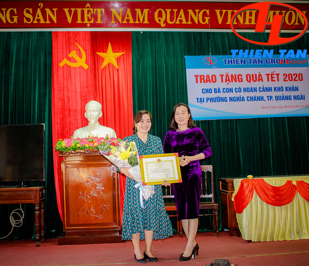 Bà Đoàn Thị Hoa, Phó Bí thư Đảng Ủy, Chủ tịch HĐND phường Nghĩa Chánh trao tặng bảng ghi nhận những đóng góp vật chất và tinh thần của Thiên Tân Group giúp các hộ nghèo vui xuân đón Tết Canh Tý 2020
