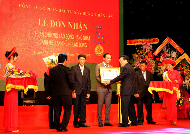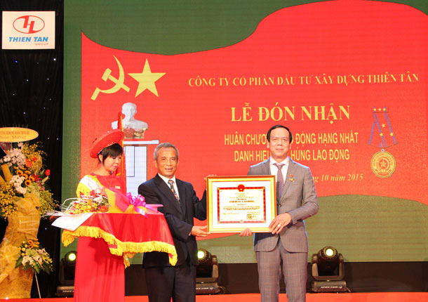 Ông Huỳnh Kim Lập – Chủ tịch HĐQT Thiên Tân Group (giữa) thay mặt tập đoàn nhận danh hiệu huân chương lao động hạng nhất.