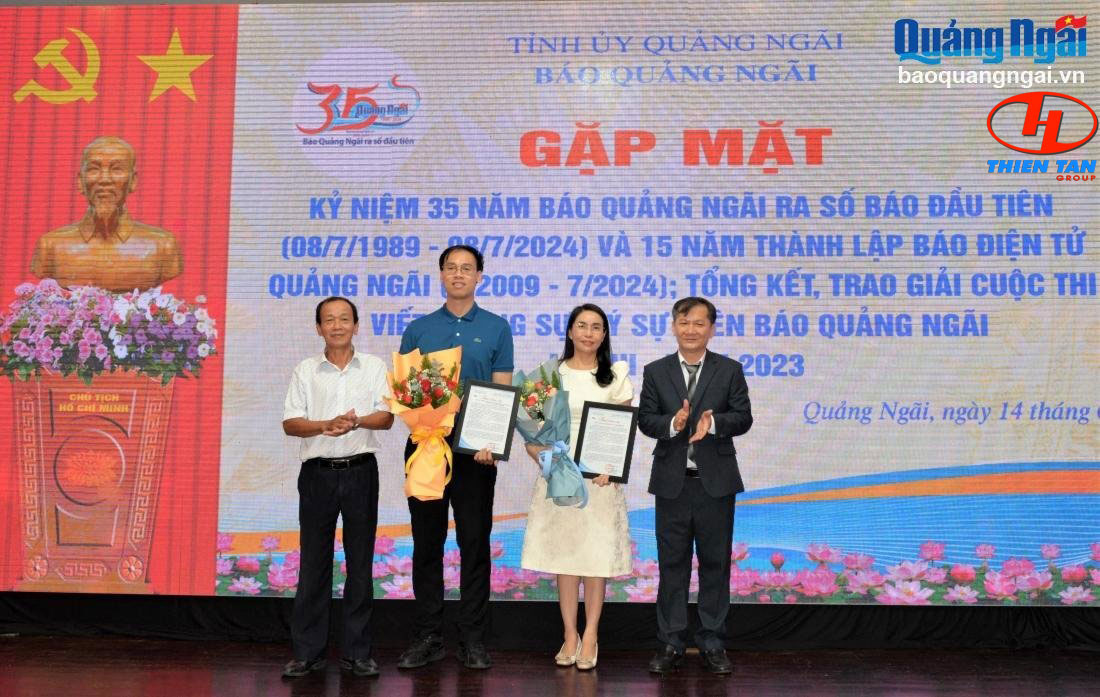 Tổng Biên tập Báo Quảng Ngãi Nguyễn Phú Đức và Chủ tịch Hội Nhà báo tỉnh Trần Cao Tánh tặng hoa và trao thư cảm ơn cho đơn vị tài trợ Cuộc thi viết phóng sự, ký sự trên Báo Quảng Ngãi.