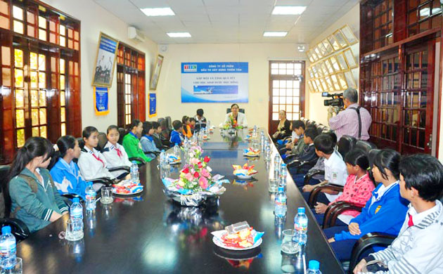 Quang cảnh buổi gặp mặt giữa Công ty Thiên Tân với các em học sinh nghèo trong chương trình “Chân trời mơ ước”.