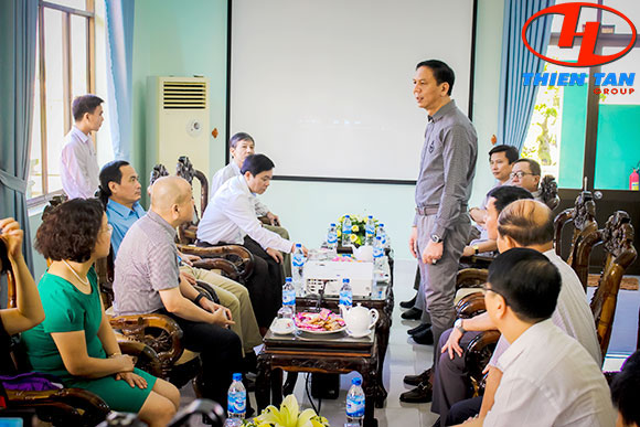 Ông Huỳnh Kim Lập, Chủ tịch HĐQT Thiên Tân Group giới thiệu về tập đoàn và báo cáo kết quả thực hiện dự án Nhà máy điện mặt trời Mộ Đức với đoàn công tác