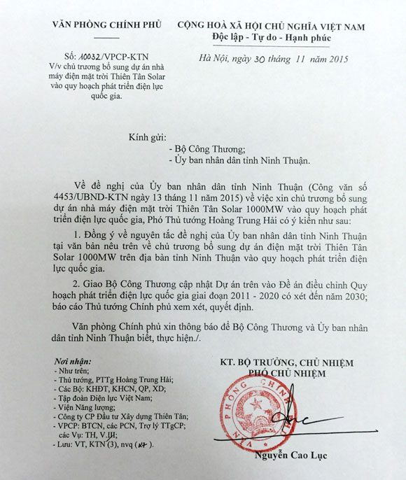 Công văn của văn phòng chính phủ về việc xin chủ trương bổ sung thêm 1000MW vào nhà máy điện mặt trời Thiên Tân tại Ninh Thuận