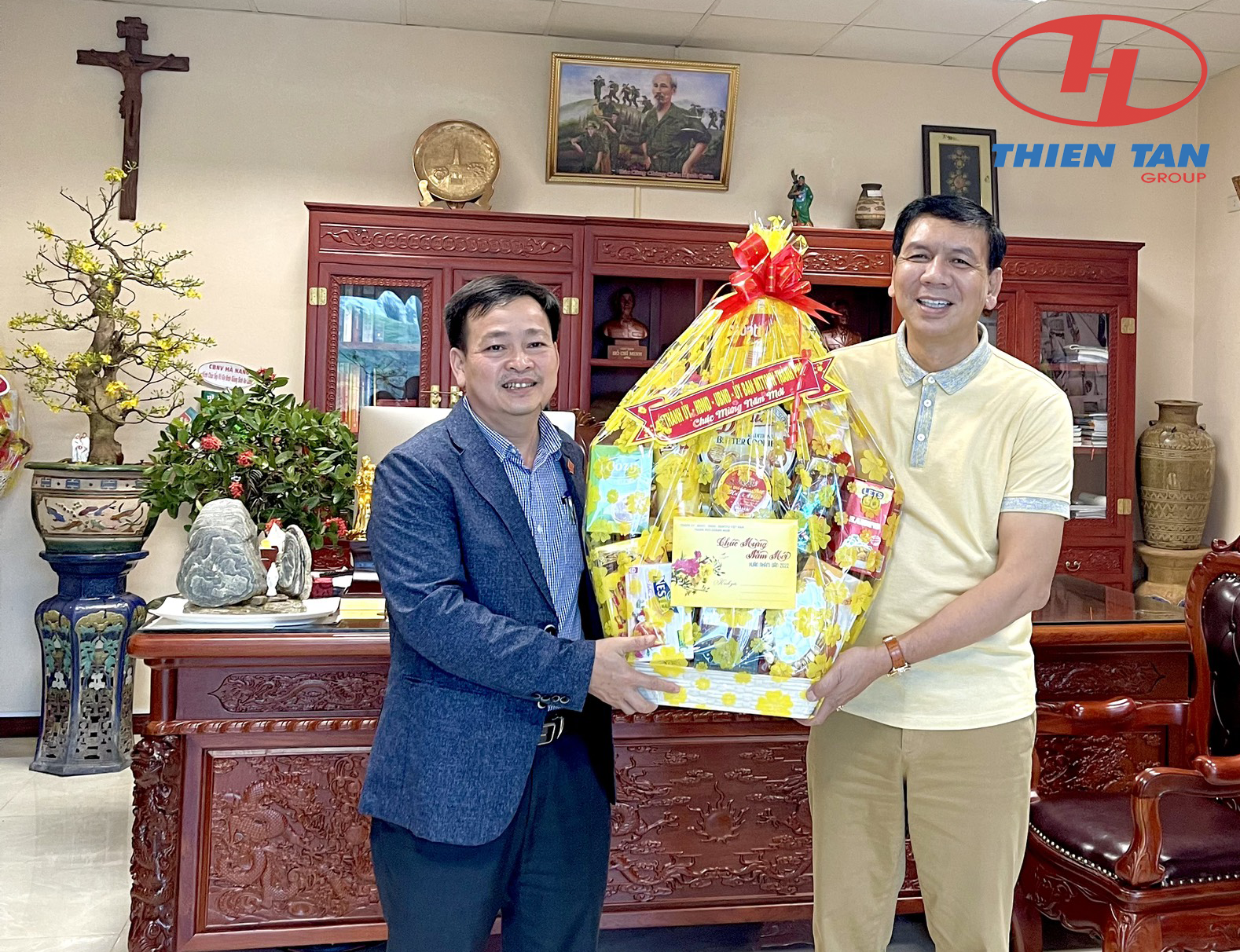 Ông Nguyễn Cao Phúc Bí thư Thành ủy tỉnh Quảng Ngãi (bên trái), đến thăm và tặng quà tết cho CBNV Thiên Tân Group.