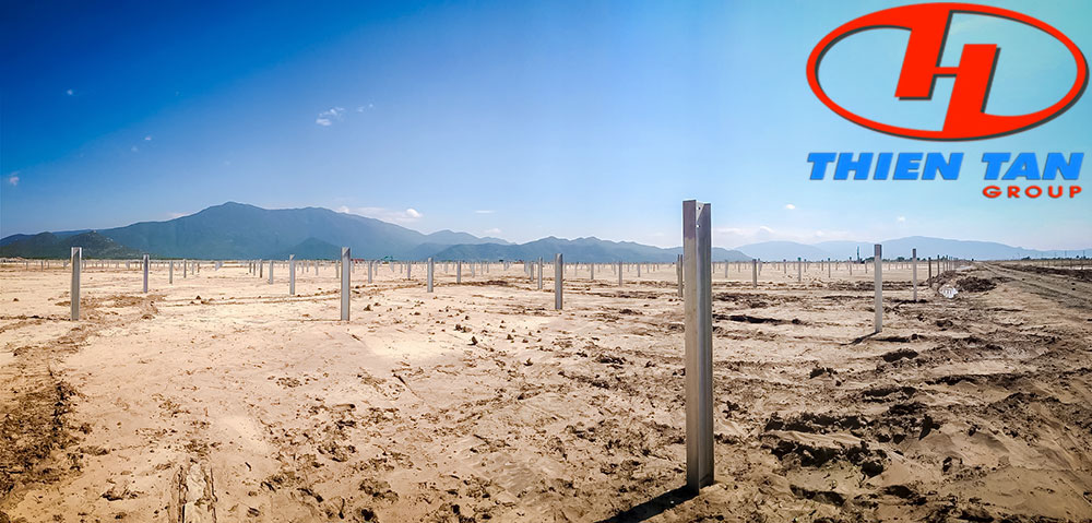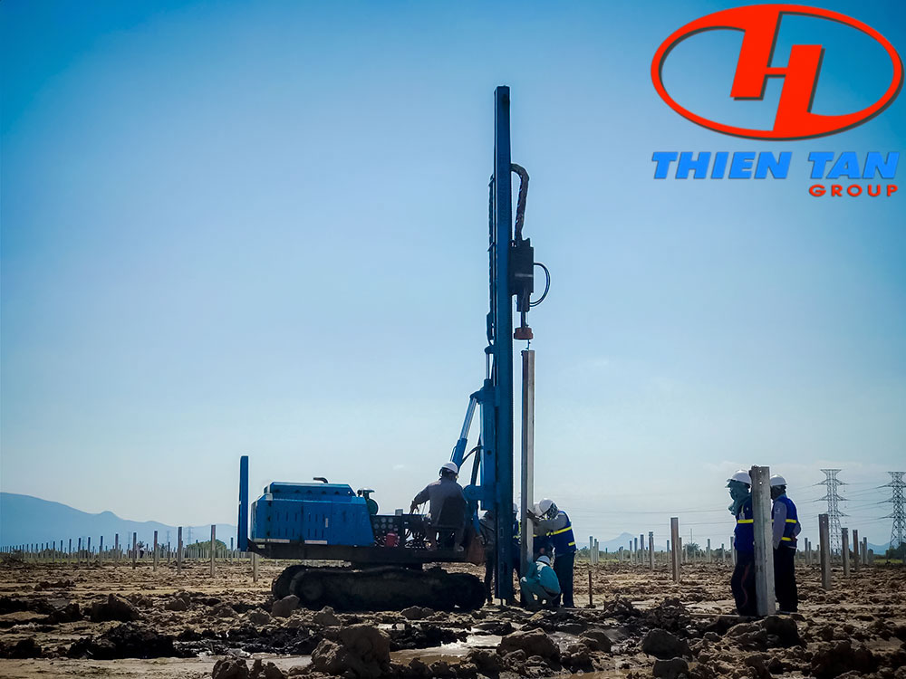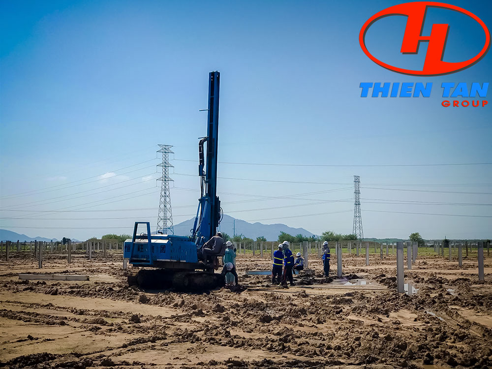 Đóng cọc là một trong những công đoạn quan trọng khi thi công các dự án điện mặt trời. Tại nhà máy điện mặt trời Thiên Tân Solar Ninh Thuận, các chuyên gia cho biết khi đóng cọc phải tính toán kỹ lưỡng khoảng cách, độ sâu và tập trung cao độ, kiểm tra từng chi tiết nhỏ nhặt nhất, chỉ một sai sót là phải làm lại từ đầu.