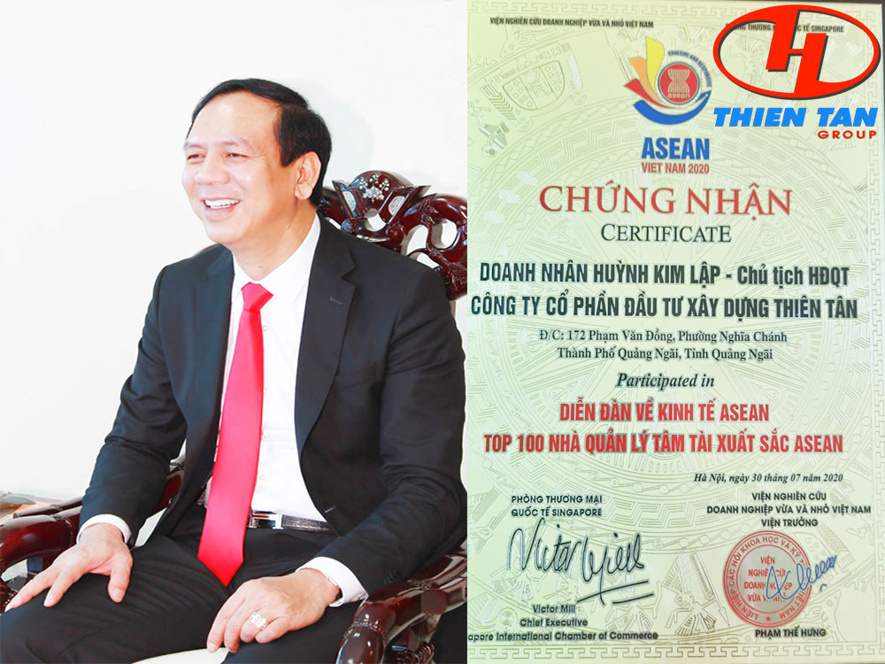 Ngoài việc được vinh danh “Top 100 Doanh nghiệp tiêu biểu Asean”, tại buổi lễ ông Huỳnh Kim Lập, Chủ tịch HĐQT Thiên Tân Group cũng được xướng tên trong “Top 100 Nhà quản lý tâm tài xuất sắc Asean”. Để được vinh danh trong danh sách “Top 100 Nhà quản lý xuất sắc”, các cá nhân phải là nhà quản lý, doanh nhân…có nhiều thành tích trong công tác nghiên cứu và ứng dụng tiến bộ khoa học kỹ thuật, công nghệ mới, có tinh thần dám nghĩ, dám làm, đạt năng suất lao động, chất lượng và hiệu quả công tác cao, đóng góp quan trọng vào sự phát triển của đơn vị, địa phương, ngành và đất nước.