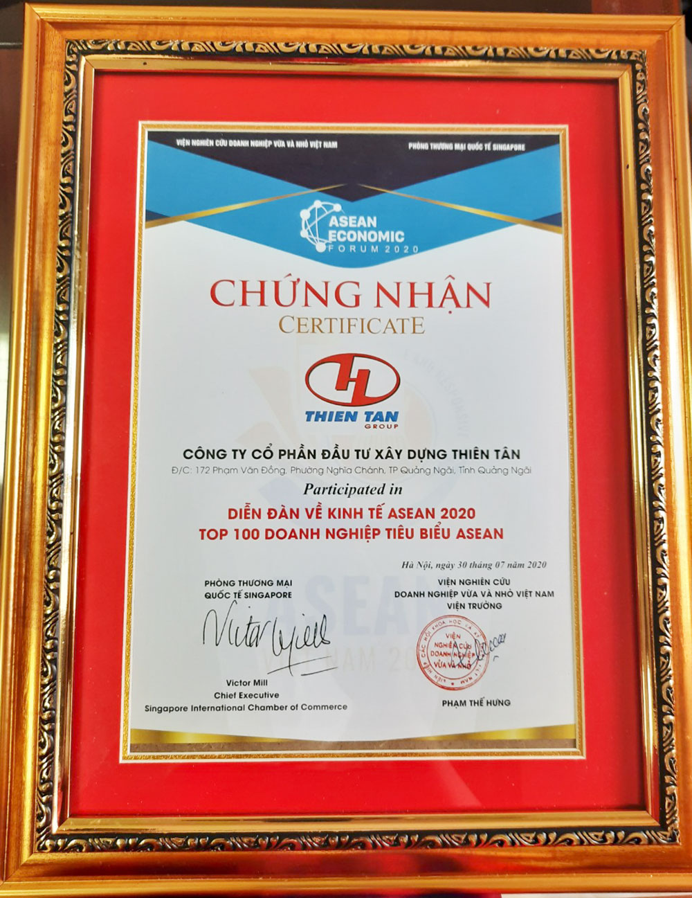 Thiên Tân Group đã xuất sắc lọt “Top 100 doanh nghiệp tiêu biểu Asean” tại Diễn đàn Kinh tế ASEAN 2020 được tổ chức tại Hà Nội hôm 31/7. "Diễn đàn kinh tế ASEAN 2020" và lễ tôn vinh "ASEAN AWARD 2020" là một sự kiện lớn, được tổ chức thường niên tại các quốc gia ASEAN (Hiệp hội các quốc gia Đông Nam Á) nhằm cung cấp thông tin, nâng cao vị thế cho cộng đồng doanh nghiệp Việt Nam tại khu vực ASEAN.