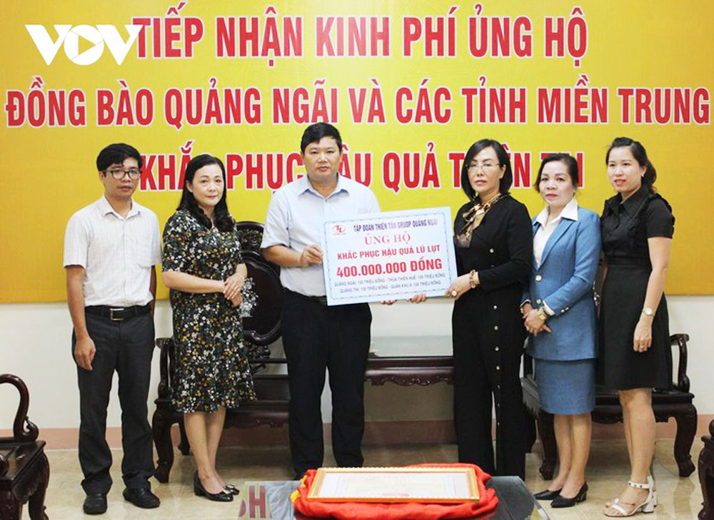 Cũng trong sáng 22/10, nhiều đơn vị đã chung tay cứu trợ đồng bào vùng lũ miền Trung. Cụ thể, tại Ủy ban Mặt trận Tổ quốc Việt Nam tỉnh Quảng Ngãi, Tập đoàn Thiên Tân Group Quảng Ngãi trao 400 triệu đồng hỗ trợ đồng bào vùng lũ Quảng Ngãi và các tỉnh miền Trung.